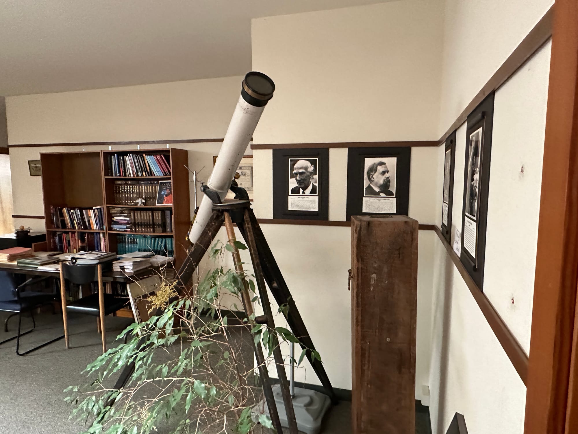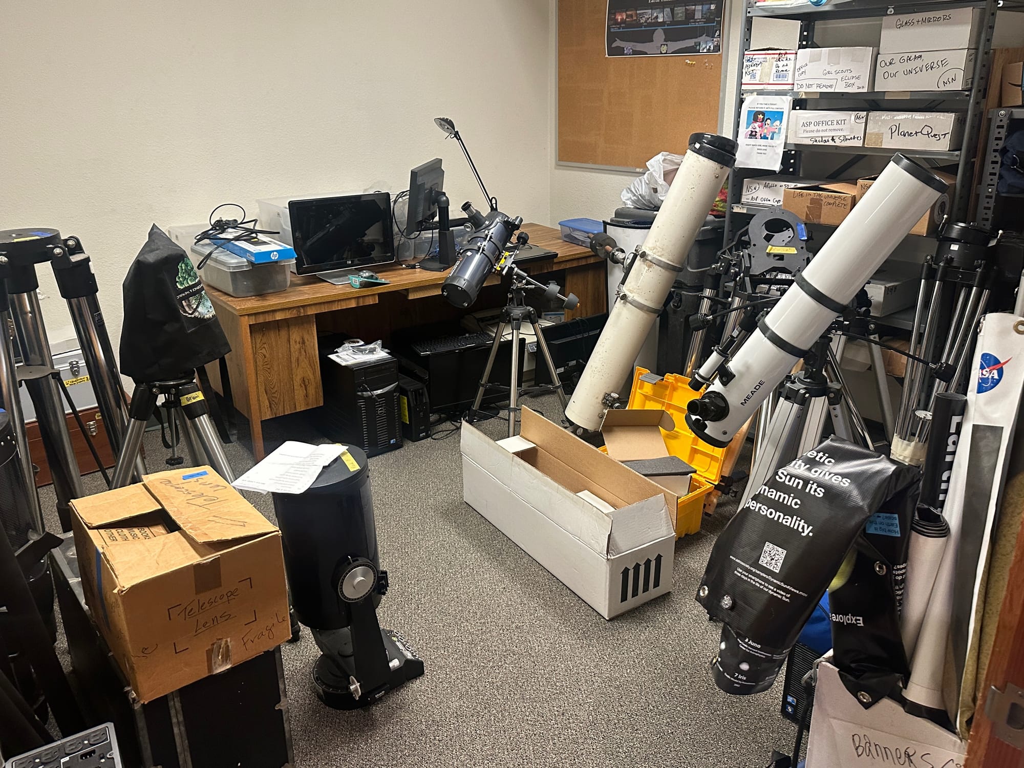 Telescopes and tripod stands crowd a back room. In one corner of the office, a Victorian-era stargazing instrument, as old as the organization itself, sits on wooden legs.