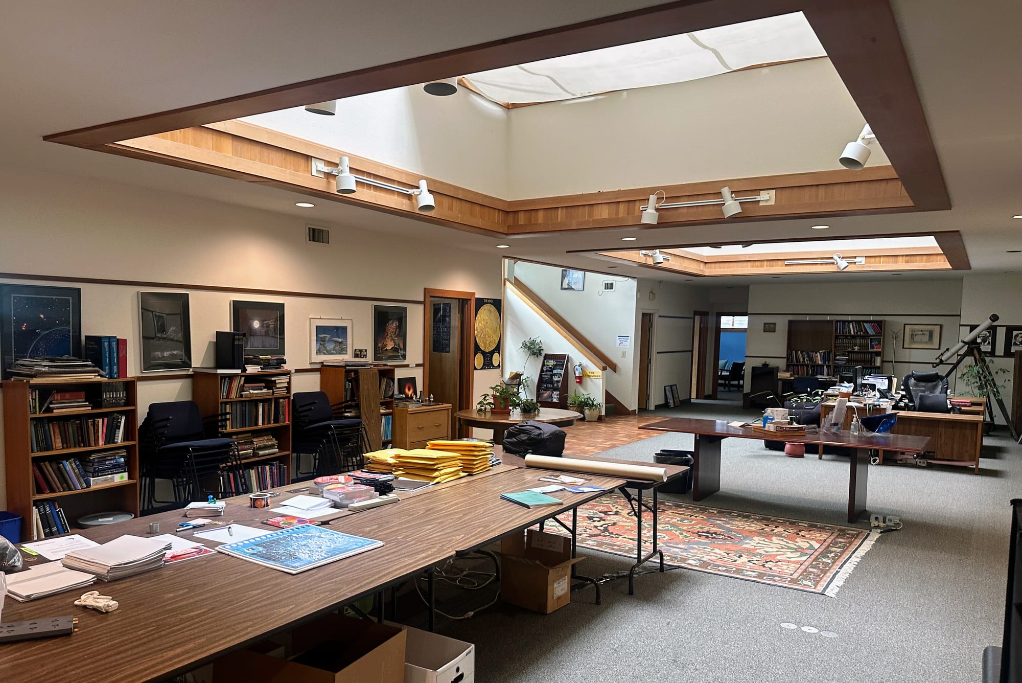 A double-door entrance swings into the open floor plan. Huge skylights illuminate the now quiet offices. Original planetary paintings, once commissioned by the Morrison Planetarium, are framed and displayed across the walls.