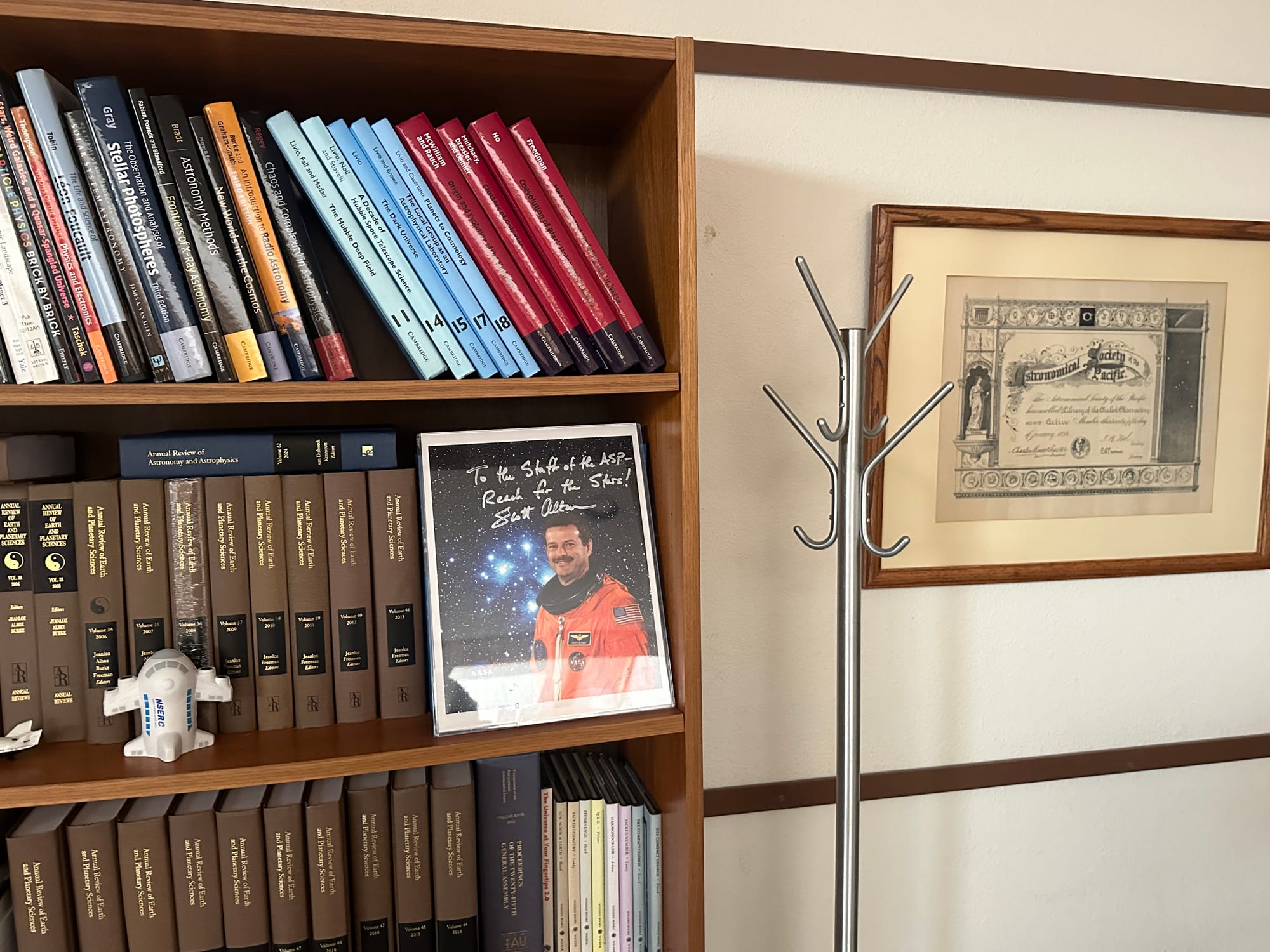 Shelves store the remains of their catalog merchandise, ranging from T-shirts to guided tours of the night sky on cassette tapes. On another wall sit stacks of books that collect research papers produced during the society’s computational astrophysics conferences.
