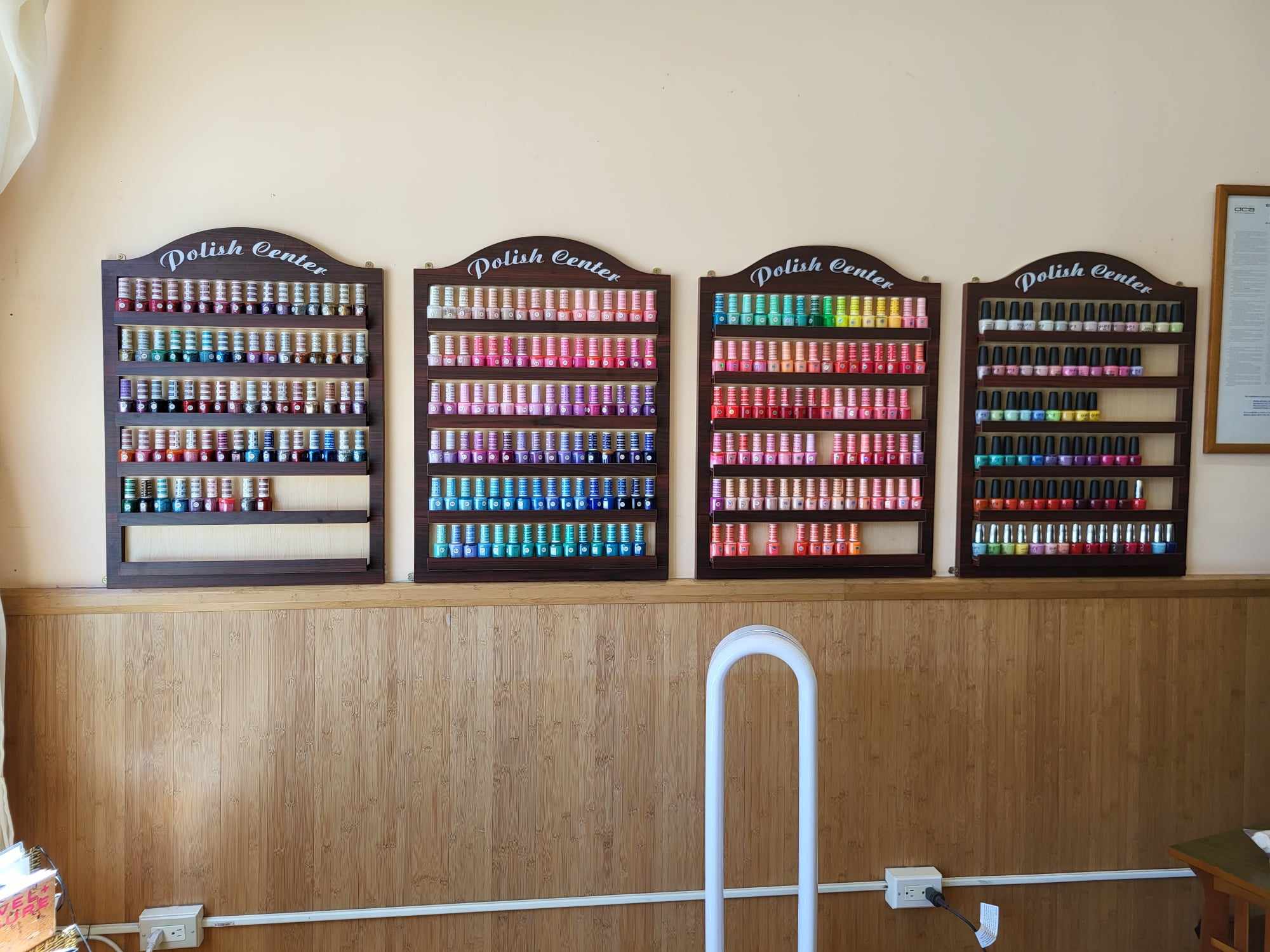 The vibrant shop has three well-cushioned pedicure stations, three manicure desks and a shelf cabinet filled with a rainbow gradient of nail polishes along with a seating area for clients.