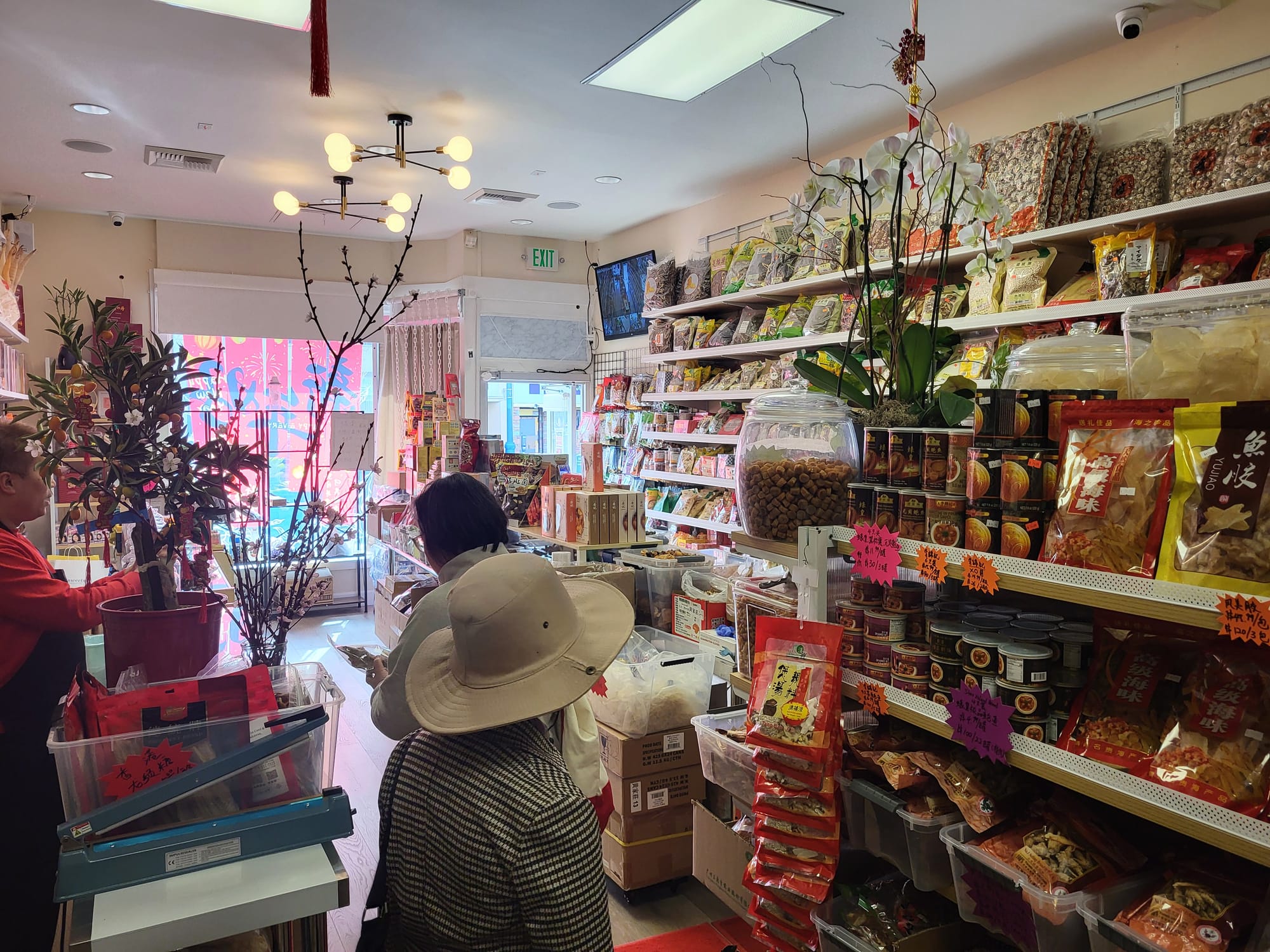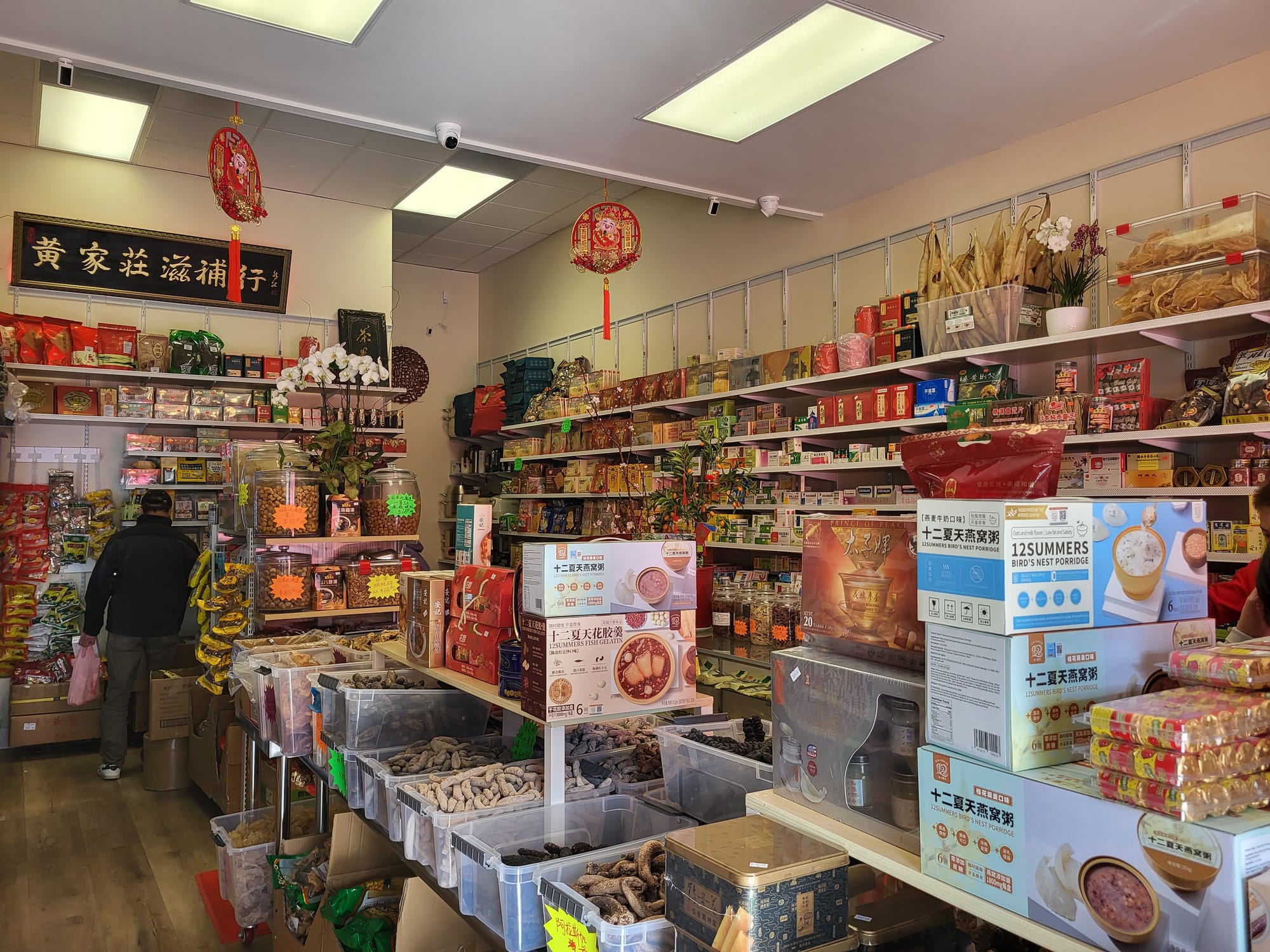 Patrons can find a variety of dried ingredients throughout the packed store. Shelves are lined with an array of dried items like scallops, chrysanthemums, mushrooms, pears, and other medicinal herbs, along with soup essentials like broth packets. Pre-packaged loose-leaf tea can also be found, like roselle and cleansing mixes.