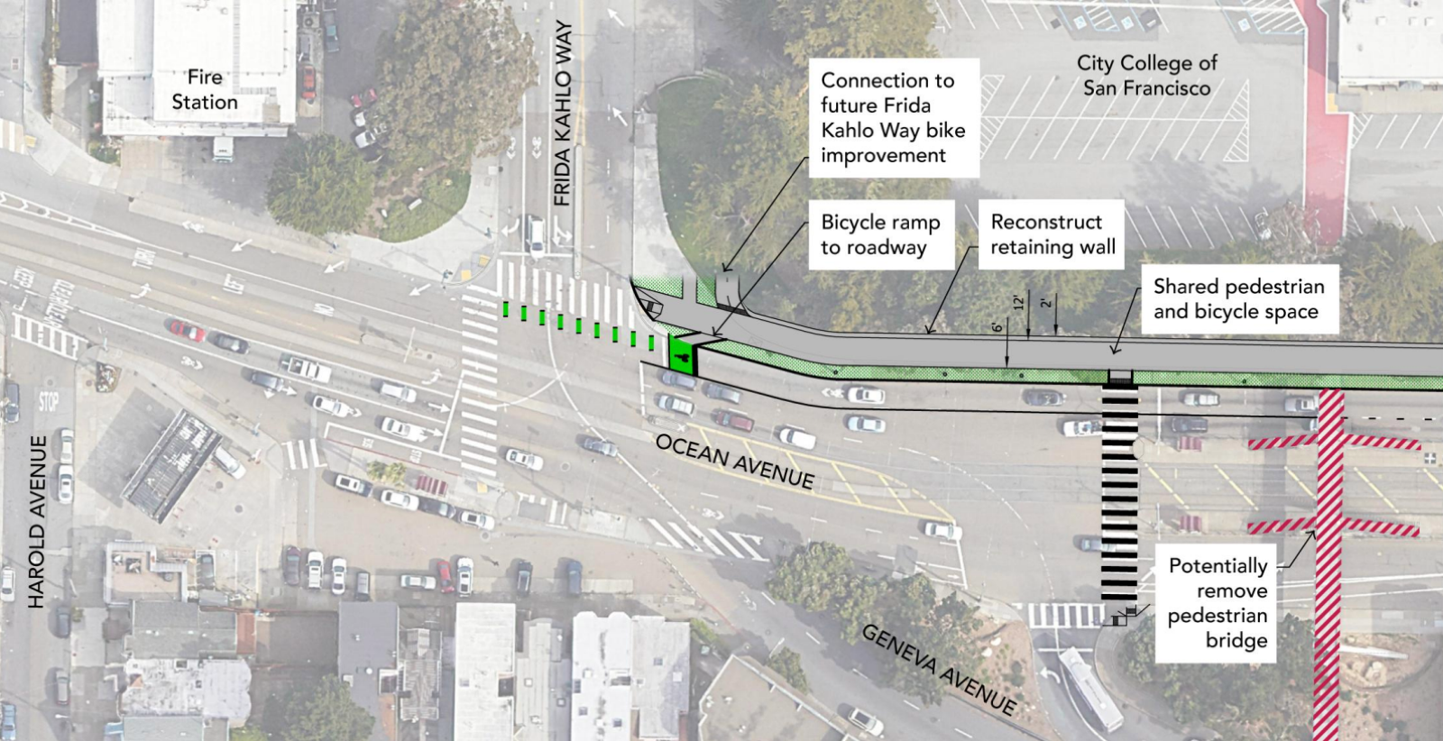 The Ocean Avenue Shared Bike and Pedestrian Path project would remove the pedestrian bridge that crosses Ocean Avenue, connecting Geneva Avenue to City College of San Francisco, and move the college’s Ocean Avenue retaining wall to create space for a shared pedestrian and bike path.
