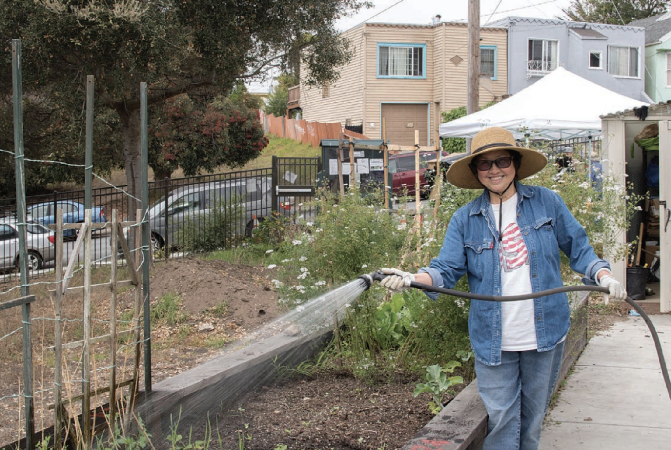 Community member and retiree Anna Chen watered her plants before helping herself to the barbecue’s locally grown roasted asparagus. She goes to Sisterhood Gardens daily, and her plot cultivates green onions, garlic and chrysanthemum greens.